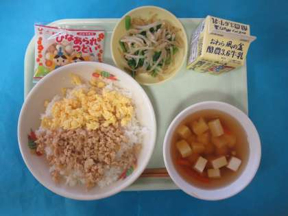 この日のメニューは、そぼろどん(とりそぼろ、いりたまご)、なばなひたし、しらたまじる、ひなあられでした。ひなまつりメニューで、子供たちも楽しみにしていました。