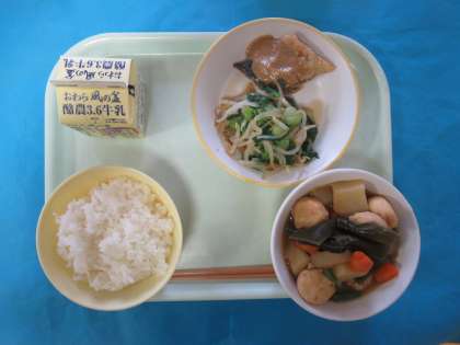 今日のメニューは、ごはん、ぎゅうにゅう、さかなのあまみそかけ、おひたし、かんとうだきです。あまみそはごまの風味がして、さばの味をひきたてていました。
