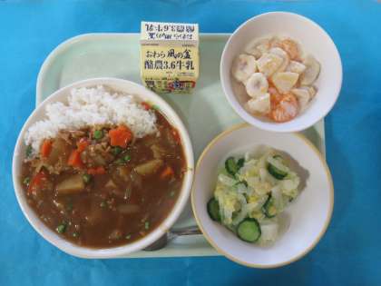 今日のメニューは、ごはん、ぎゅうにゅう、カレーライス、フレンチサラダ、フルーツヨーグルトです。今年度最後のカレーライス、子供たちはとてもうれしそうにいただいていました。