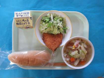 今日のメニューは、コッペパン、ぎゅうにゅう、あじフライ、ブロッコリー、ぶたにくのしょうがやき、ゆかりあえ、けんちんじるです。やさいたっぷりのけんちんじるをいただき、体もあたたまりました。