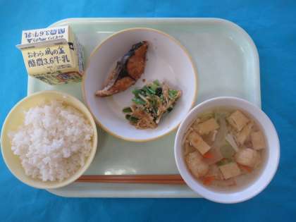 今日のメニューは、ごはん、ぎゅうにゅう、ふくらぎのかばやき、はりはりあえ、ごもくじるです。ふくらぎはあまからくあじつけされており、とてもおいしくいただきました。