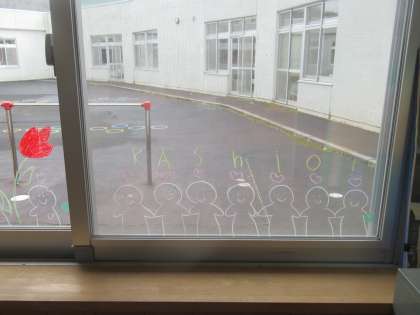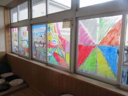 消えるクレヨンで絵を描き、学校を明るくしました。子供たちの思いがこもった絵になっています。