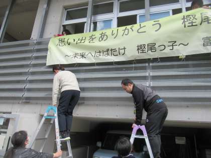 子供たちが作成した「ありがとう」の看板等を外しました。学校では、閉校のための後片付けに取り組んでいます。さみしい思いをしています。
