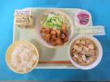 今日のメニューは、ごはん、牛乳、さかなのくろずあん、はくさいひたし、かんとうだ...