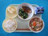 今日のメニューは、ごはん、牛乳、さかなのくろずあん、はくさいひたし、かんとうだ...