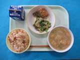 今日のメニューは、ごもくごはん、ぎゅうにゅう、さかなのかばやき、はりはりあえ、...
