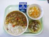 今日の献立は、麦ご飯、カレーライス、ふくじん和え、フルーツポンチです。