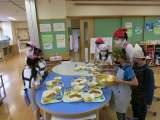 今日の献立は、えびパオツ、小松菜のごま和え、ホイコーロー、味付け小魚、です。