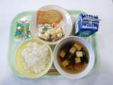 今日の献立は、おさかなカツ、ポテトサラダ、わかたけ汁、かしわもち、です。