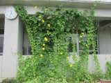 4年生が育てているへちまの花が、たくさん咲いています。丈も屋根に届く勢いです。