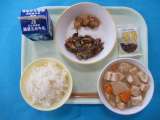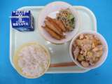 今日のメニューは、ごはん、ぎゅうにゅう、ほたてのこうみやき、もずくのチャプチェ...