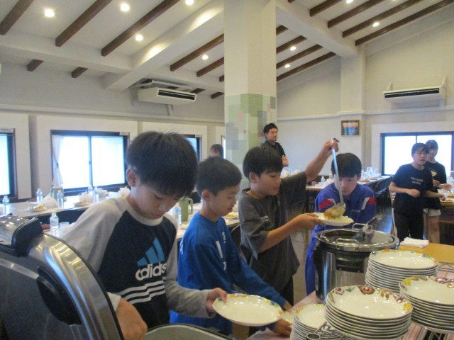 食事係が協力して夕食の準備をしました。たくさん食べて、明日の登山に備えます。