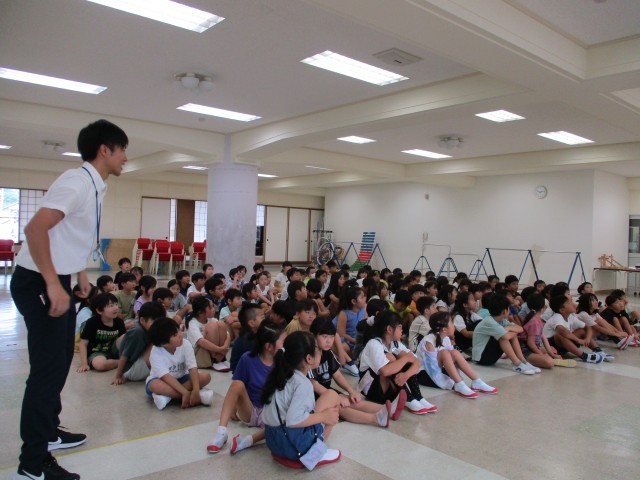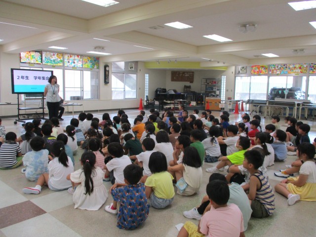 2年生では、着任式と始業式が終わったあとに、ランチルームで学年集会を行いました。