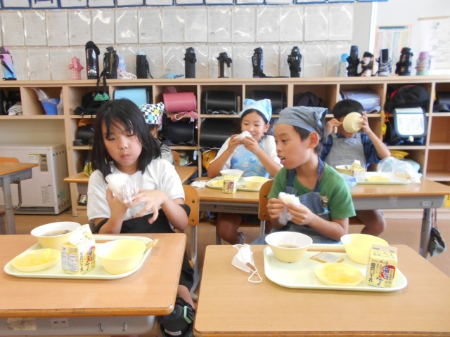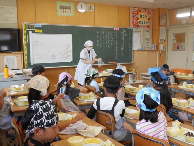 今日の給食は「防災の日献立」でした。ナイロン袋を利用したセルフおにぎりや日持ちする野菜を使った味噌汁、フルーツ缶詰などが出ました。調理員さんにおにぎりの作り方について説明を聞きました。災害が起きるとライフラインが止まり、お皿を洗うことが簡単にできなくなることや食べるものが限られることも知りました。