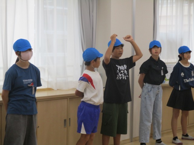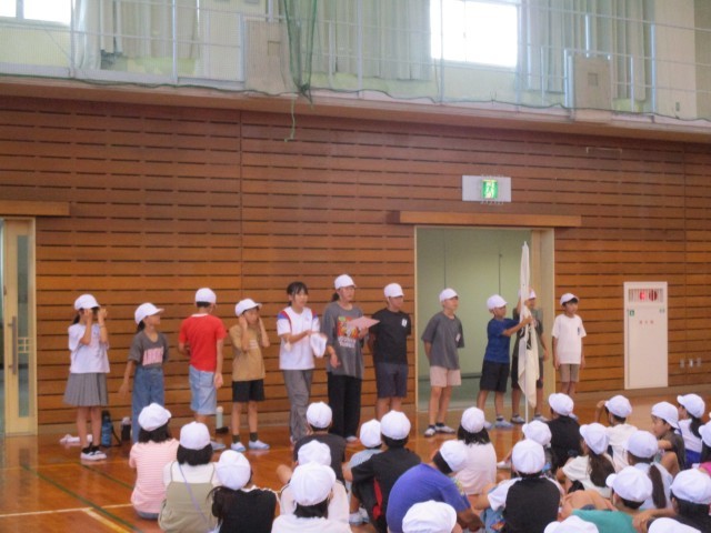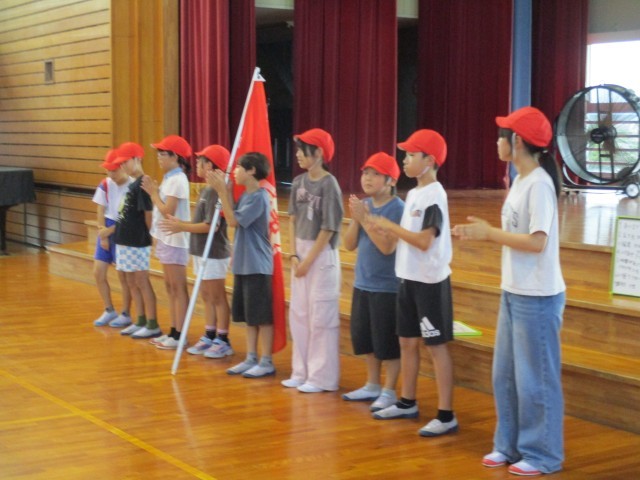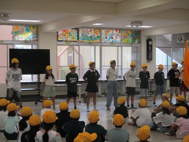 全校の前に立って初めて応援練習をしました。団役員を中心に6年生が進んで声を出していました。