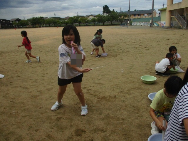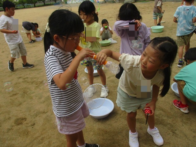今日はしゃぼん玉遊びの2回目をしました。前回よりも道具を工夫し、様々なしゃぼん玉を飛ばし、楽しみました。