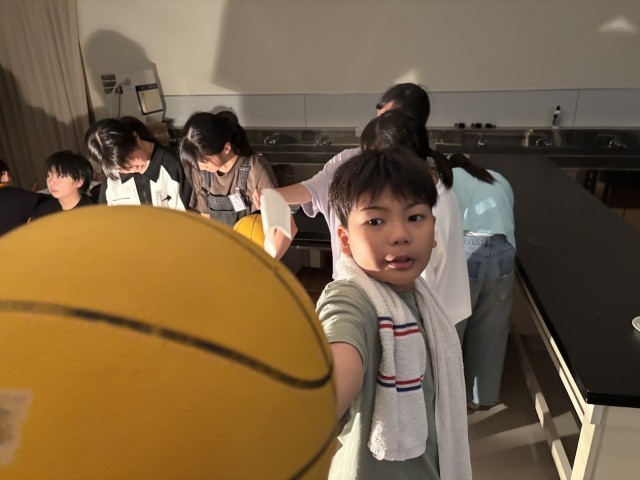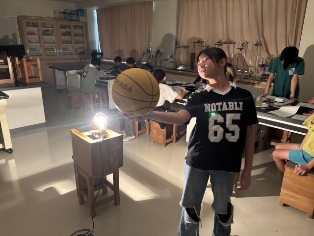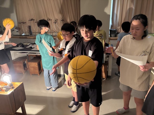 ランプの明かりを太陽の光、バスケットボールを月に見立てて、月の形が変わって見える様子を再現しながら実験しました!