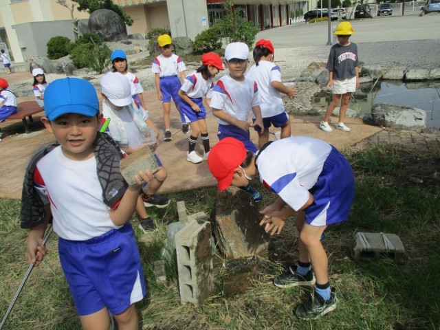 生活科の時間に、池の周りやグラウンドで「生き物さがし」をしました。