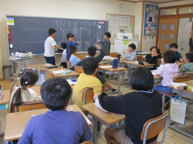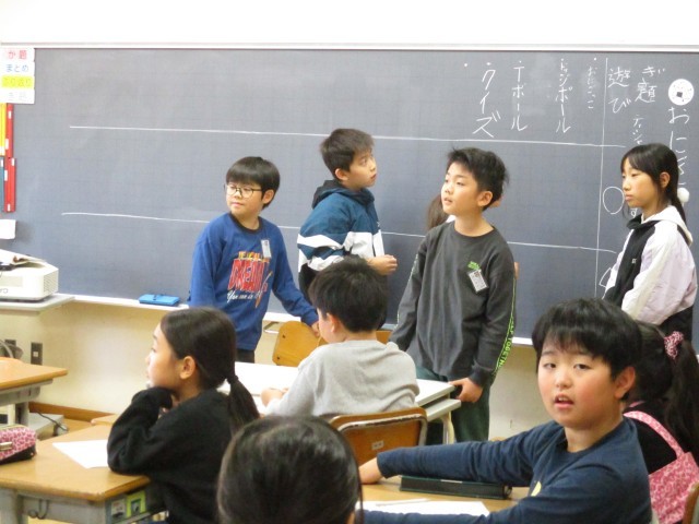 4年生 国語科「クラスみんなで決めるには」 公開日 2025/10/30 更新日 2025/10/30 4年生 外国語活動でインタビューし合ったことを基に、ALTの先生と行う集会の遊びを決める話合いをしました。