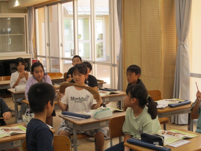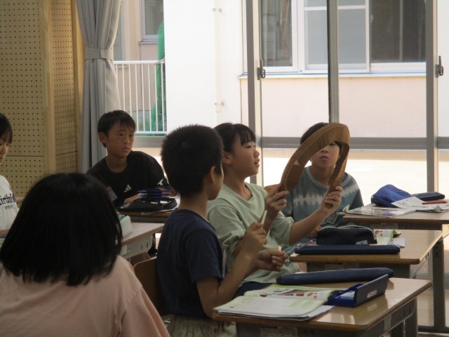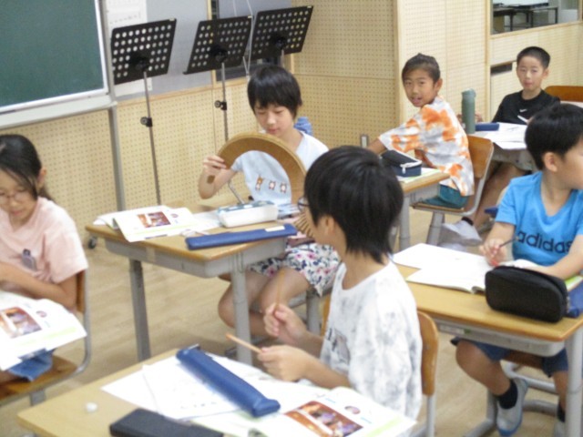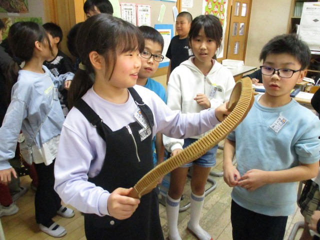 富山県の「こきりこ」を鑑賞しました。実際に「びんざさら」を鳴らしてみました。