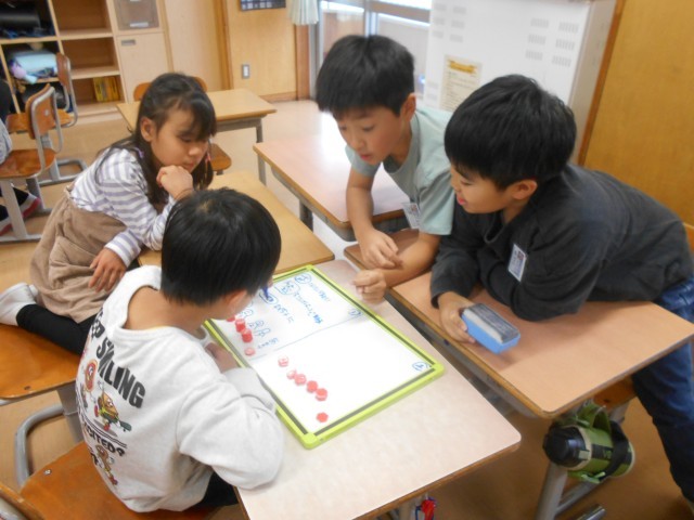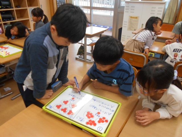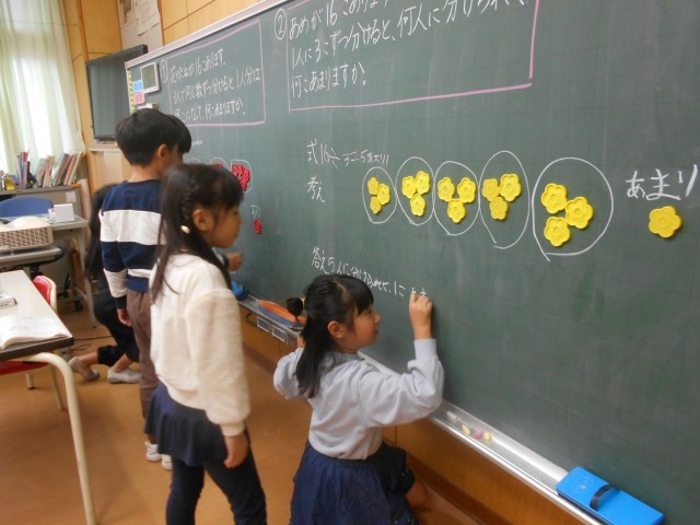あまりのあるわり算の学習では、一人ひとりで考える時間とグループで考える時間を設けて学習を進めています。一人だと分からないことでも、友達となら分かるということが子供たちは楽しいようです。