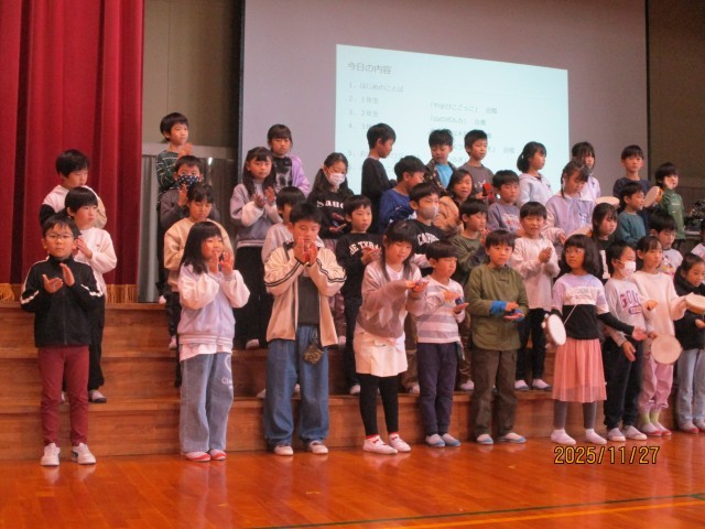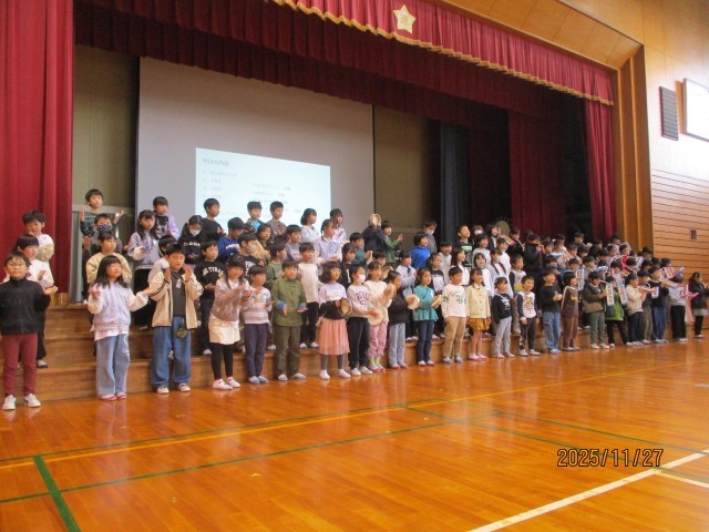 全校集会「チャレンジ 思いやり きらきら☆集会ーすてきな音楽ー」で、「山のポルカ」を発表しました。