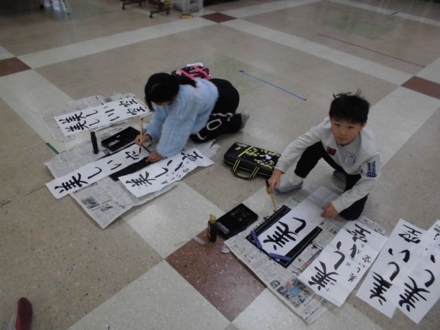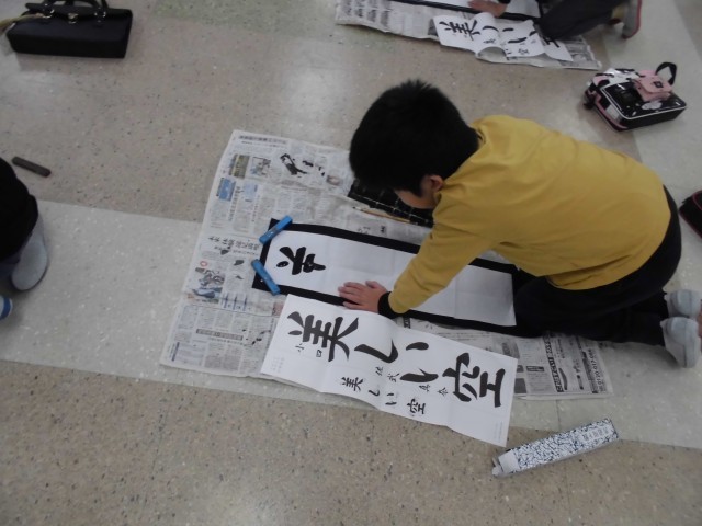 4年生では、書写の時間に書初めの練習をしています。