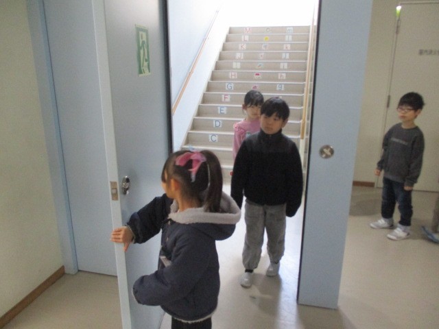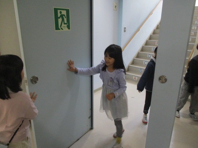 防火扉を通過する訓練を行いました。火事が起きたことを想定し、真剣に取り組んでいました。