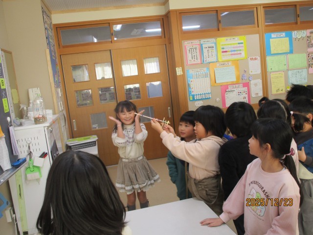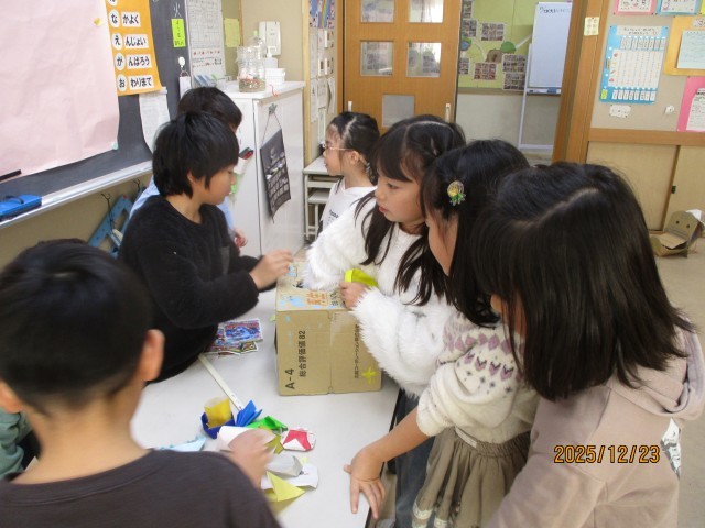 学級目標の「みんなえがお」を合言葉に、楽しい会になるようにと、係ごとに出し物を決めて準備しました。生き物クイズやくじびき、射的、ビンゴゲーム、宝さがしゲームをして楽しみました。頑張って準備した結果、みんな笑顔になりました。