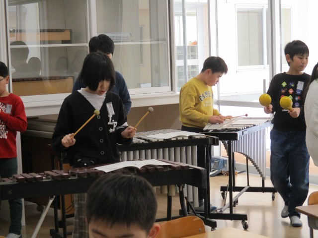 「茶色の小びん」の担当楽器を決め、練習しています。