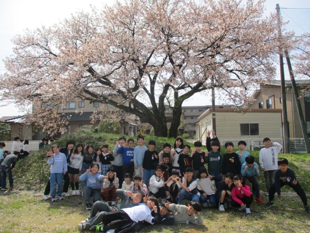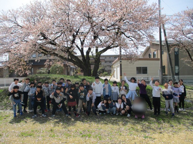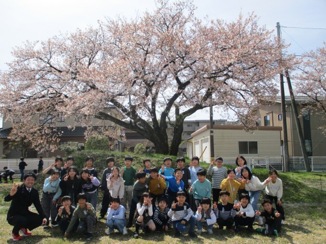 新年度が始まりました。桜の前で写真を撮りました。上学年の仲間入り、頑張ります!