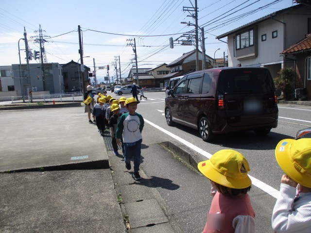 そのあと、実際にみんなで道路を歩きました。「道路をわたる時には、一度止まって左右確認!」「わたる時には手を挙げる!」などの約束を守って安全に歩くことができました。