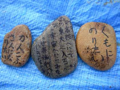 これまで学校だよりでお知らせしてきました通り、石碑「大志」の下から思い出の石を掘り出しました。当時の1年生から6年生までの児童がマジックで将来の願いを石に書いたものです。「くもにのりたい」「東大に入る。宇宙へいってみたい」等の願い事が読み取れました。中には、字が薄くなって読み取りにくいものもありましたが、一度ご覧いただければと思います。場所は、グラウンド東側の大きな桜の木の下で、現在は、砂利敷の駐車場です。来年の1月末までは、ブルーシートにのせておきます。