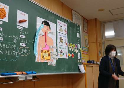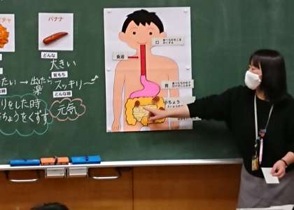 各クラスで、養護教諭、栄養士の先生と一緒に、自分の「うんち」について、考えました。自分たちがしているうんちを振り返り、毎日「バナナうんち」が出せるようにするには、どんな術があるかを教えていただきました。