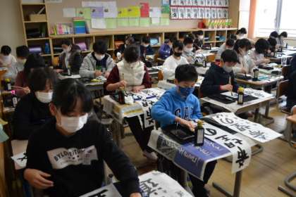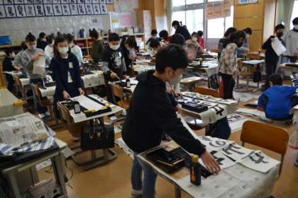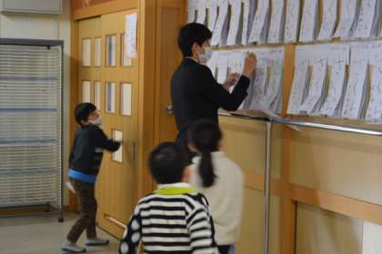 「全集中!」 真剣な顔、顔、顔。 書き終えた作品は、すぐに廊下に掲示しました。