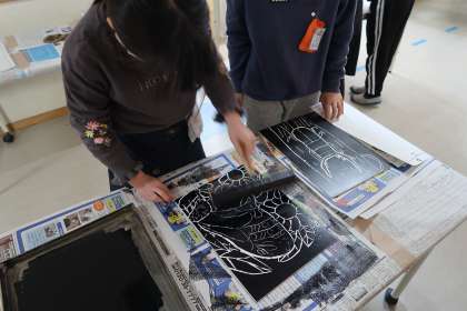初めて版画を刷りました! 公開日 2021/01/28 更新日 2021/01/28 3年生 彫刻刀で一生懸命彫った版画を刷りました。友達と協力して、彫った線がはっきりと出るように、丁寧に作品を仕上げました。