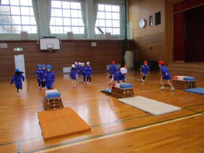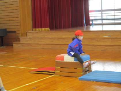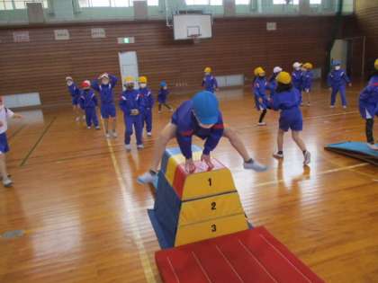 体育の学習では跳び箱遊びに取り組んでいます。跳び箱にまたいで乗ったり、色々な高さの跳び箱に挑戦したりしています。