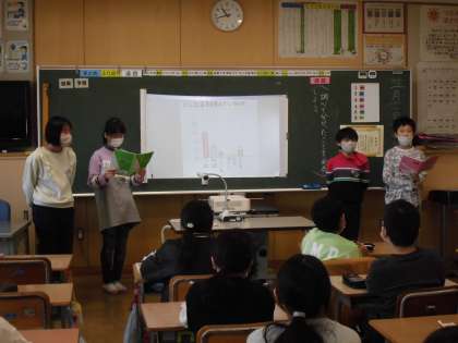 4年生は、国語科「調べて話そう、生活調査隊」の学習をしています。子供たちは、学級のみんなの生活について興味をもったことをアンケートで調べ、結果から分かったことをグループごとに発表しました。グラフを使ったり、発表の文章の構成を工夫したりして、分かりやすく発表しようと努力していました。また、自分たちの生活を見直すよい機会にもなりました。