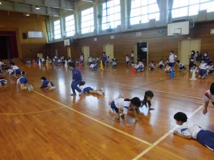 学年で体育をしました。走ったり止まったりジャンプをしたりと、いろいろな動きを楽しみました。