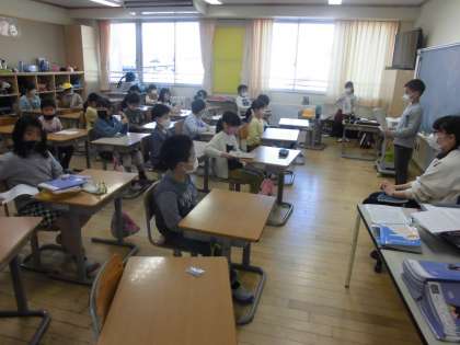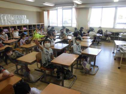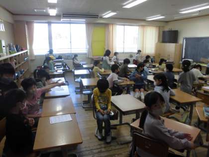 朝、登校後の様子です。まもなく朝の歌が始まる8:00頃、子供たちは準備を整えています。