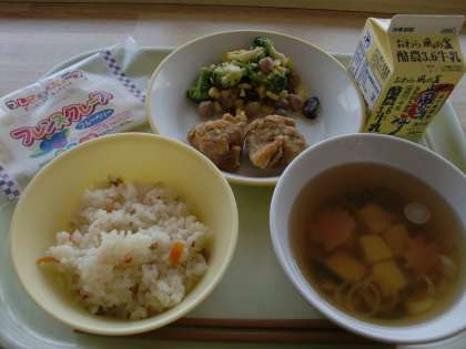 今日の給食は、1年生の入学と2〜6年生の進級をお祝いする特別献立を実施しました。