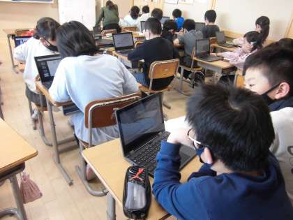 5年生:「クロムブックを使って」:4月23日(金) 公開日 2021/04/23 更新日 2021/04/23 5年生 社会科の時間にクロムブックを使い、日本の国土について調べました。 一人一人集中して取り組んでいました。