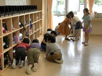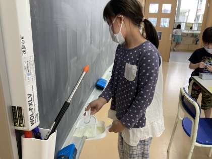 いつも元気な2年生。今日もはりきって掃除をしていました。ほうきやぞうきんで環境を整えた後は、窓ふきや扉の溝掃除など、それぞれができることを考えて行動していました。