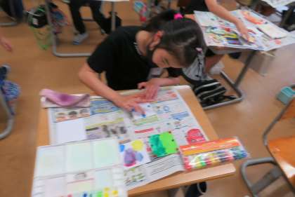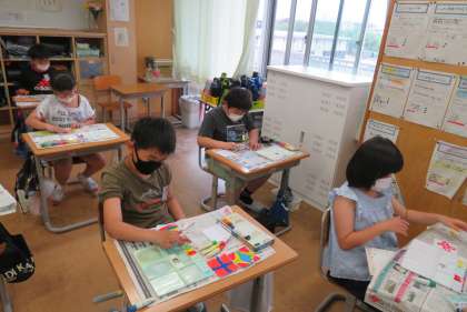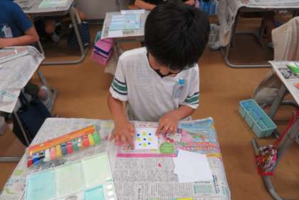 図画工作科では、「色合い ひびき合い」の学習をしました。指に絵の具を付けて、小さい画用紙に思い思いに着色しました。指でとんとんとスタンプのように色を着けたり、模様を描いたりするなど、作品作りを楽しみました。