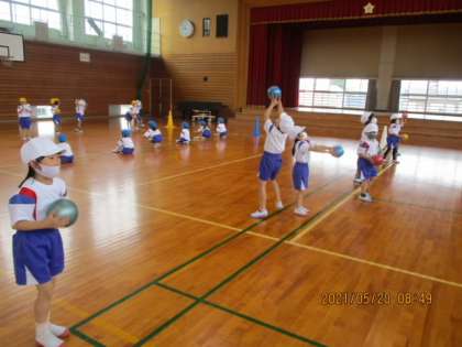 体育の授業では「ボールあそび」をしました。色団ごとの整列にも少しずつ慣れて、素早く動くことができる子供たちが増えてきました。「ボールあそび」では高くボールを投げたり、ペアのお友達とのキャッチボールを楽しんだりする様子が見られました。