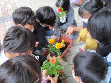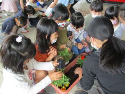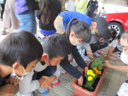 各クラスのグリーンメイトさん(お花のお世話の責任者さん)が花の苗を植えました。6年生さんの説明を真剣に聞いて、心を込めて花を植えることができました。毎日水やりをがんばっています!