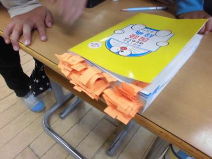 国語辞典で、言葉の意味を調べています。自分がどれだけ辞典を使ったから分かるように付箋を貼っています。