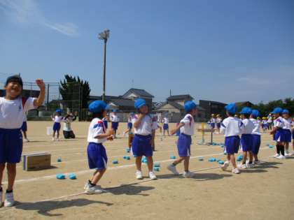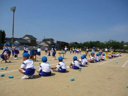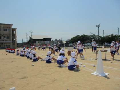 1年生は体育学習公開で50m走と的当て遊びを行いました。