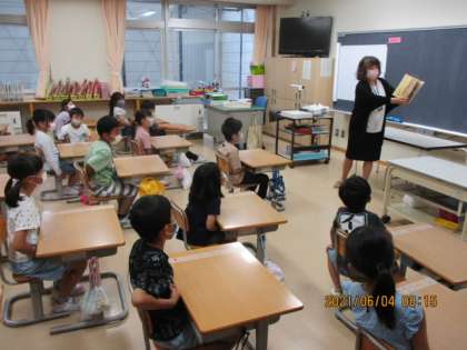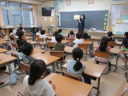 1年生は先日、お話の会がありました。読み聞かせの先生に絵本を読んでもらいました。絵本の内容や展開に前のめりになって聞き入っている子供たちが多かったです。