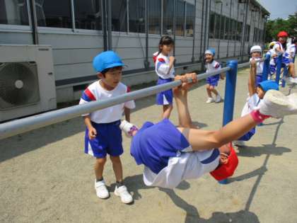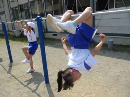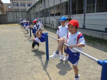 1年生 体育科 鉄棒 公開日 2021/06/18 更新日 2021/06/18 1年生 体育の時間に鉄棒を使った運動をしています。ぶら下がり技の難関「ちきゅうまわり」のマスターを目指して少しずつ頑張っています。 「できるようになりたい!」という思いから、鉄棒が得意な友達に「教えて!」とこつを聞く姿が印象的でした。たくさんの技ができるように、頑張ります。